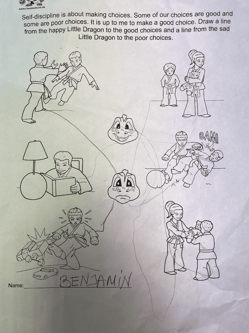 Here we have the activity sheets from last week and in the Dojang, the children were learning how they can control their self-discipline in their warm up activity. This week the children will be playing ‘Sabum says’, which is basically ‘Simon says’. The children will learn that exercise is a discipline and not a punishment.