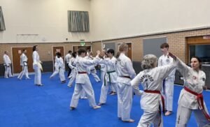 Colour belt adult class practising their set-sparring. We run 13 years+ sessions at our Hitchin venue 3 times a week.