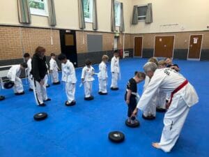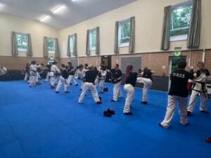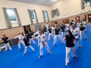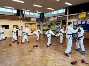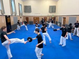 Stevenage Black Belts Black Belt session in Stevenage. Practising some sparring techniques with a partner.